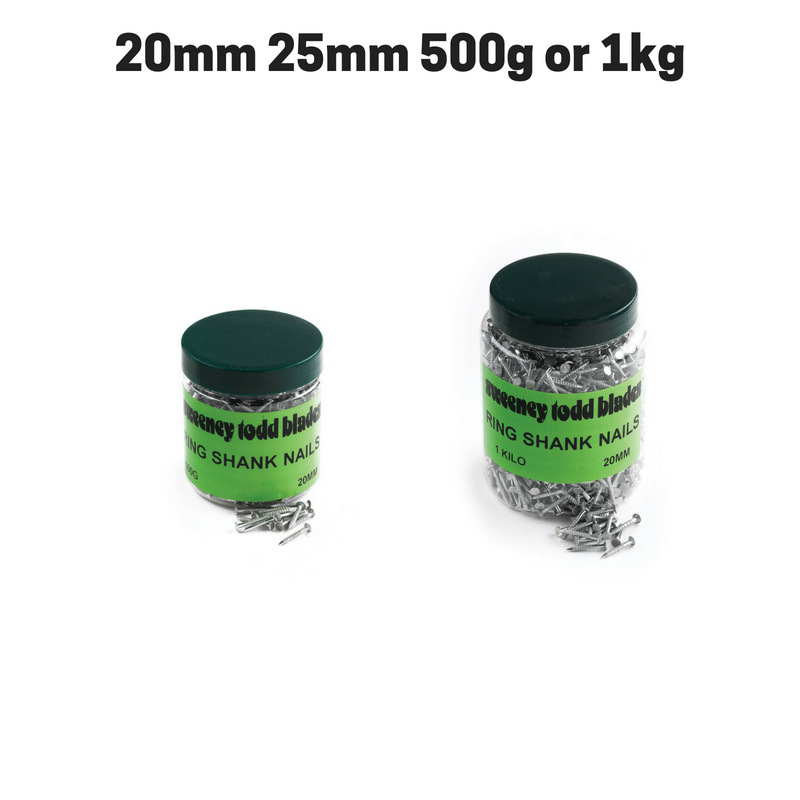 Ring Shank Nails – Sold in 20mm or 25mm length, and 500g or 1kg tubs.